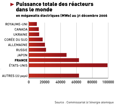 http://futura24.site.voila.fr/ * Les projets nucléaires pour les champions français de l'atome: Chine: Pékin s'est engagé sur la construction de 2 réacteurs EPR pour 8 milliards €. Contrat signé en 2007 avec Areva, EDF et l'électricien local CGNPC. Etats-Unis: le groupe Constellation projette de construire 4 réacteurs EPR en association avec Areva et EDF. Le choix de la technologie est arrêté, mais il doit maintenant être validé par les autorités américaines de contrôle. Royaume-Uni: outre-Manche, EDF et sa future filiale, British Energy, devraient construire 4 EPR, auxquels s'ajouteraient 2 réacteurs du même type construits par l'allemand E.ON. Principe arrêté. |