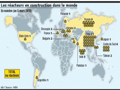 Source: Le blogueur Arte * début 2012: 67 réacteurs nucléaires en construction dans le monde Source: www.sfen.org |