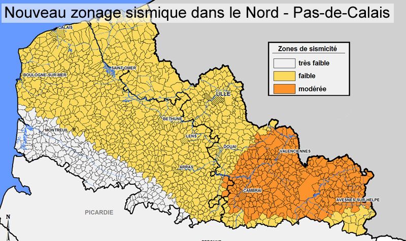(http://www.lavoixdunord.fr/) La France se dote d'une nouvelle carte de zonage sismique qui fixe les règles en matière de construction dans les zones à risques, qui seront harmonisées avec celles de l'Union européenne. Ce nouveau zonage, qui fait passer de 5.000 à 21.000 le nombre de communes concernées, entre en vigueur ce dimanche 1er mai. Le Nord - Pas-de-Calais se trouve divisé en trois zones: sismicité très faible, faible et modérée. Les textes légaux pour cette nouvelle