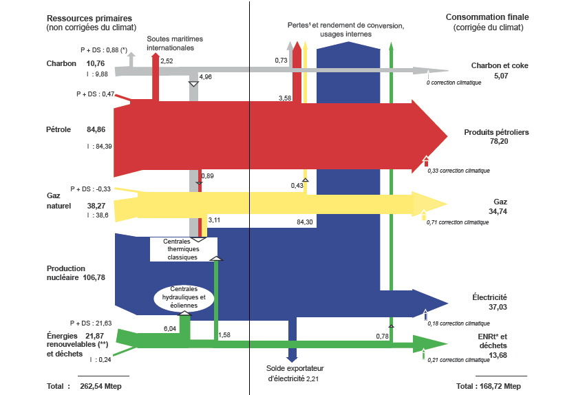 A gauche: la production (pour le nucléaire, c'est environ 100 Mtep