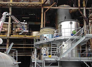 La sucrière a du également acquérir de nouvelles machines, notamment deux cuves, un nouveau décanteur pour fournir un jus plus clair et un système de désincrustation. Seule une grue de très forte capacité permet la mise en place des nouvelles cuves et le gabarit exceptionnel des pièces a nécessité des affrètements particuliers et une logistique sans faille. Une double innovation