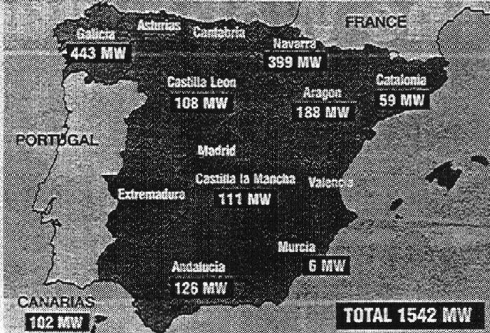 Fin '99, la puissance éolienne installée dans le monde était de 13.455 MW. "COURANT VERT". Le port d'Amsterdam va ériger 7 éoliennes de 660 kW hautes de 65 mètres dans le quartier Westpoort. En tout c'est 21 éoliennes qui seront érigées dans les environs (Windnieuws , mai 00, p.10). DANEMARK. Ce pays a atteint, fin 1999, 10% de sa production électrique uniquement généré par le vent, soit 1750 MW. Rien qu'en 1999 pas moins de 426 éoliennes ont été mises en service, puissantes, en moyenne, de 760 MW (même source p.23) ESPAGNE. C'est l'envolée du représentant de Vestas en Espagne. 67% de ventes en plus en 1999 qu'en 1998. Les actions ont réagi par une hausse de 10%. La Gamesa Eolica, S.A. a reçu la commande de 1.800 moulins de 660 kW à installer jusqu'en 2001 (idem). · Envolée de tout l'éolien en Espagne. Le fait que l'Etat garantit, pour 5 ans au moins, au producteur d'énergie électrique issue du vent, un prix élevé au kWh a fait croitre de 85% la capacité éolienne entre1998 et 1999. Les moulins vont de 300 à 1.650 kW et le total installé, fin 1999 était de 1.542 MW (idem), voir figure: BELGIQUE. Visite, en car, par les Compagnons d'Éole, d'éoliennes auto-construites et commerciales de Hollande, le samedi 2 sept. Départs de Nivelles et Rumst. Infos & inscriptions au 067 21 64 42. NB. La clôture se fera au 15/8/00 et priorité accordée aux membres C.E. FRANCE. La France, si fière de sa technique (atomique à tout le moins) s'est vu forcée de faire appel au hollandais Lagerwey pour livrer 5 éoliennes de 750 kW destinées à Tourcoing. L'une est installée sur les terrains de l'industrie Verhaeghe et tourne depuis juillet. Les 4 autres le seront sur la jetée du port de Boulogne pour tourner fin 2000. |