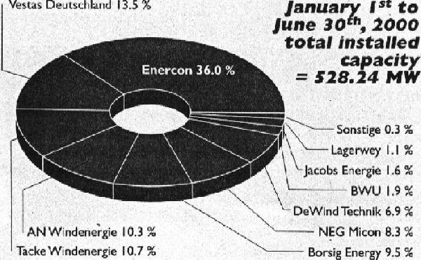 ENERCON Vue impressionnante de la nacelle, vide, de l'une des éoliennes de 1,8 MW, en montage dans la ville autrichienne de Bruck an des Leitha (ancienne frontière de l'Est). cliquer sur l'image pour taille MAXI ALLEMAGNE De janvier à fin juin 2000, ce sont 493 éoliennes qui ont été rajoutées aux 7'877 qui tournaient déjà dans ce pays. Pour Noël, elles seront 9'000. La loi du 1er avril 00 contraint les compagnies électriques à payer l'électricité produite par les éoliennes, durant 5 ans, à au moins 3,67 FB du kWh |