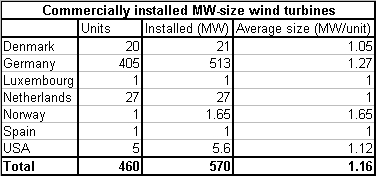 Tableau des éoliennes commerciales (appartenant à des compagnies électriques ou à des grosse industries) de plus d'un MW de puissance, qui ont été installées en 1998 en divers pays: ![]() |