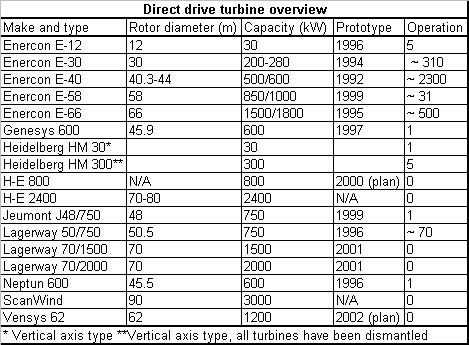TRANSMISSION DIRECTE Ce type d'éoliennes, dont le rotor (partie tournante de la génératrice de courant) tourne à la même vitesse que les pales, éliminant ainsi le multiplicateur de vitesse, trouve de plus en plus d'adeptes. C'est Enercon, qui l'inventa en 1992. Voici les productions d'autres fabricants: ![]() · Jeumont Industrie, dans cette liste, est, avec Vergnet, le seul producteur d'éoliennes en France. Ce pays, qui a tout misé sur le nucléaire, doit, malgré toutes ses capacités techniques (nous tairons le "fameux" "Charles- de-Gaulle" nucléaire), faire appel à l'étranger pour installer des éoliennes plus efficaces, moins coûteuses, moins polluantes, plus rapides à installer (3 jours), et ne produisant AUCUN déchet que ses centrales nucléaires si menaçantes. ![]()