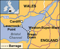 Map of barrage site The barrage would stretch from south Wales to the Somerset coast |