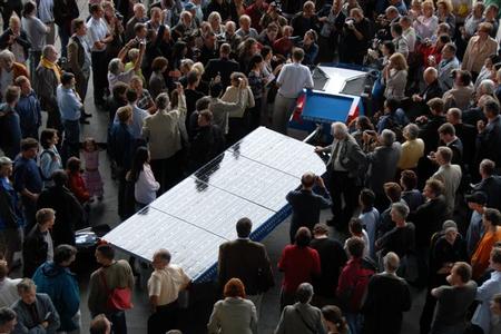 A chaque étape de son périple, Louis Palmer embarquera un passager. AP/URS FLUEELER Début d'un tour du monde en voiture solaire http://www.lemonde.fr AFP | 09.07.07 Parcourir plus 50.000 kilomètres dans cinquante pays en seize mois, grâce à six mètres carrés de panneaux solaires. C'est l'objectif que le Suisse Louis Palmer, 35 ans, s'est fixé au volant de son "taxi solaire", alimenté exclusivement par l'énergie de l'astre du jour. Le projet, issu d'une collaboration entre la Suisse et l'Allemagne a été présenté lundi 9 juillet à Berlin, deuxième étape du parcours. M. Palmer, arrivé au volant de sa voiture en compagnie de la secrétaire d'Etat à l'environnement allemande, Astrid Klug, a indiqué pouvoir rouler 100 kilomètres par jour grâce aux panneaux solaires recouvrant le véhicule, conçus par la société allemande Q Cells. "Louis Palmer endosse une importante fonction d'ambassadeur: il montre qu'il existe des alternatives viables aux modes de déplacement qui dominent les pays industrialisés", a salué Mme Klug. |
