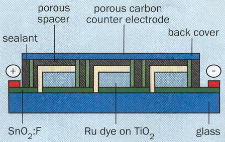 These particles are small - no more than 20 nm - so there is a large surface area that is available to absorb light. A standard Graetzel cell consists of a liquid electrolyte that is sandwiched between two transparent conducting electrodes. This set-up gives the dye molecules a supply of electrons and results in a high energy efficiency. Graetzel recently improved on the cell's performance. He said: "I am very excited about a new dye that gives better results than the one that we used in 1991. We are currently working on a promising new generation of organic transfer dyes."