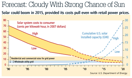 Sources: Bloomberg Financial Markets; FT Interactive, Reuters Fundamentals and Worldscope via FactSet Research Systems; U.S. Department of Energy. Sources: Bloomberg Financial Markets; FT Interactive, Reuters Fundamentals and Worldscope via FactSet Research Systems; U.S. Department of Energy. Sources: Bloomberg Financial Markets; FT Interactive, Reuters Fundamentals and Worldscope via FactSet Research Systems; U.S. Department of Energy. Solar power is still more expensive than fossil fuel generated electricity. But the gap is closing. The rule of thumb in the solar business: Every time the volume of solar cells doubles, its cost drops by 20%: ![]() According to the International Energy Agency, by the end of 2005 Germany led the world with the most installed photovoltaic systems (1.43 million kilowatts) followed by Japan (1.42 million kilowatts). The U.S. was a distant third (480,000 kilowatts). (Click here for more information.) The race is on to find a way to make solar grow up so that it can compete, dollar-per-watt, against any fuel on the planet. The long-term forecast? Bright, with big patches of innovation ahead. |