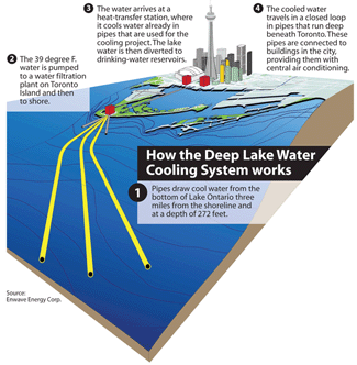 Perhaps the most ambitious connection is Queen's Park, seat of the provincial government, located about two miles from the lake. The legislature and some nearby government office buildings were connected in April, saving four megawatts of electricity. New buildings that join the Deep Lake Water Cooling System should never have to build cooling units. Among them is a 25-story condominium complex built by Tridel, a local developer, in downtown Toronto. It was hooked into the project from the start. The system has other benefits besides saving energy. Most office and apartment towers have cooling units on their roofs. Removing them means the roof can be used for something else, perhaps a running track. The three original van der Rohe towers have cooling units built between floors, appearing as black, windowless bands from the outside. The owner is now working out how to convert those areas into office space, which is almost as precious as electricity in downtown Toronto. Still, the largest benefit created by the cooling system has been to reduce the city's demand for electricity during in the peak summer season. The two transformer stations at each end of Toronto's financial district has been hard-pressed to keep up with demand from computers, lighting, and air conditioning. "Toronto Hydro gives Enwave a check every time we sign a new building on their grid," says Enwave's Mr. Loughborough. "We call it 'nega-watts,' where instead of creating new generating capacity, you lower the demand for power." Other cities could benefit from similar systems: