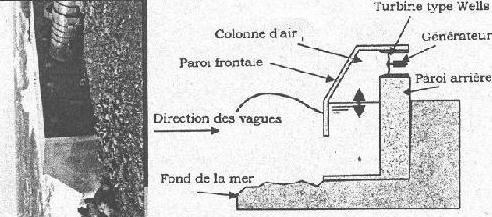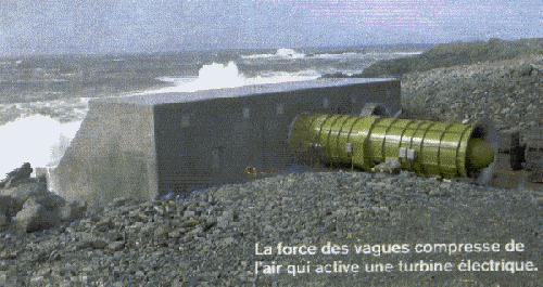 | "Limpet" est la première centrale márémotrice financée (en partie) par la Commission européenne (programme Joule); elle peut être reliée au réseau de l'île d'Islay (site donné également dans nos liens) qui pourra ainsi se libérer du recours aux énergies fossiles. Cette Limpet (ou Land Installed Marine Power Energy Transformer), de 0,5 MW (Pour mémoire, La Rance fait 240MW), a été lancée fin 1998 sur cette île intérieure des Hébrides, au large de la côte ouest de l'Ecosse, par un consortium mené par la société Wavegem, d'Inverness, avec des partenaires d'Irlande et du Portugal. Une première usine, plus petite, a fonctionné à Islay de 1990 à 1999. | Limpet est constituée de deux éléments de base: un collecteur pour capter l'énergie de la marée et une turbo-génératrice pour transformer cette énergie en électricité. Un fossé de 25 m de large a été creusé dans les falaises de l'île et recouvert d'une structure en béton formant une cavité creuse. La marée y pénètre et comprime l'air qui, à son tour, actionne les turbines au sommet de la construction. Cette structure, extrêmement solide, peut résister aux tempêtes les plus violentes. On estime que si moins de 0,1 % de l'énergie renouvelable au sein des océans pouvait être transformée en électricité, la quantité produite suffirait à satisfaire plus de 5 fois les besoins en énergie actuels du monde entier (Cordis Focus) |