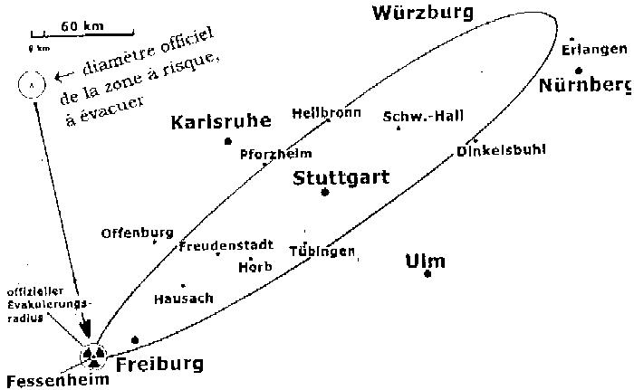 Elle est d'un rayon de 5 à 10 km, voire 30 km tout au plus, selon les pays. A Tchernobyl on s'est contenté de 8 km. L'Ökoinstitut de Darmstadt (D) a étudié de façon plus rationnelle cette zone décrétée ronde par des "experts", tenant , lui, compte d'un vent moyen de sud-ouest avec pluie. Il démontre qu'à 370km de distance, l'impact serait encore grave. n accident, dans la centrale française de Fessenheim (deux réacteurs de 920 MW) contraindrait à évacuer tous les logements et lieux de travail de grandes villes allemandes, telles: Freiburg, Freudenstadt, Tübingen, Stuttgart, Heilbronn et Schwäbisch Hall.