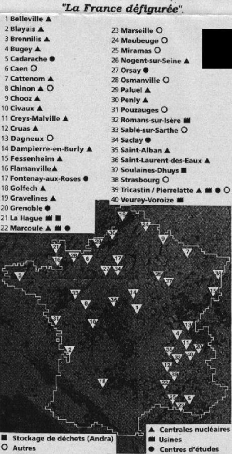 Tandis que la centrale de Temelin (deux reacteurs VVER de 981 MWe, fabriqués par SKODA et "ameéliorés" par Westinghouse voient leur construction s'achever, les gouvernements autrichien et le Ministre allemand de l'environnement Jürgen Trittin s'inquiètent. Il reste des questions de sécurité à résoudre. Le combustible a cependant été chargé dans le réacteur no1. Le gouvernement allemand a demandé, à son tour, de ne pas le mettre en service. Vaclav Havel reproche à 1'Autriche de lier le futur de Temelin à l'accession de son pays à l'Europe (Nucleonics Week) PREPARATION aux catastrophes nucléaires Lors de la 3ème Conférence Internationale à ce sujet qui s'est tenue à Baltimore(AP) du 20 au 25 août, il fut révélé que 4 heures après qu'une valve formée à Three Mile Istand (Harrisburg) en 1979, ait causé la fusion du tiers du combustible nucléaire au coeur du réacteur, le public en ignorait tout (NdlR: vous lirez avec profit un No entier de la G@zette Nucléaire consacré à ce sujet !). Le Russe Victor Vladimirov, chef du centre de recherches stratégiques à EMERCOM, y a également admis qu'au moins 8.000 personnes sont mortes après Tchernobyl de maladies reliées à la radioactivité et que, selon les officiels Ukrainiens, un nombre estimé à 3,4 millions de personnes en Ukraine souffrent encore de ces effets DECHETS NUCLEAIRES Si, en décembre 1998, le gouvernement français décidait de mettre en fonction deux laboratoires pour enfouir les déchets nucléaires dans les couches géologiques profondes, c'est en mai 1987 que les mêmes avaient "identifié" des zones "favorables" pour ce faire. 4 Régions allaient recevoir un laboratoire de recherches (à transformer en dépôt pour déchets de haute activité et de longue vie. Las, personne n'en voulait de ces déchets malgré que l'ANDRA offrait à chaque collectivité locale "accueillante" 369 millions de FB pendant 15 ans. La 6ème édition de l'Atlas or the World situe les endroits visés. RUSSIE Le réacteur nucléaire VVER Rostov-1, de 1000 MWe, dont la construction a commencé en 1978 (!) devrait pouvoir commencer à fonctionner ces mois-ci. La construction fut suspendue en 1990 après l'accident de Tchernobyl. Le lobby nucléaire Minatom dit pouvoir achever et mettre très bientôt en fonctionnement les réacteurs Rostov-2, Kalinin-3, Balakovo-5 et Kursk-5 dont les travaux ont commencé entre 1980 et 1987. Petit détail: Kursk-5 est un type RMBK, tout comme celui qui explosa en 1986 à Tchernobyl. Il était aussi un sous-marin célèbre, le Koursk... BULGARIE Cette fois, ce sont les officiels bulgares qui s'inquiètent de la centrale nucléaire vieillisaante de Kozdoduy, dont les réacteurs 1 & 2 ont 25 ans d'âge. Les incidents s'y multiplient mais comme elle fournit 40% de l'électricité du pays... "On continue!" SYNDROME du GOLFE Le colonel US, le Dr Assav Durakovic, devenu professeur en médecine, a révélé à la Conférence de Paris, de l'Association de Médecine Nucléaire, le 3 sept., qu'il a détecté une présence significative d'uranium appauvri dans 12 des 17 vétérans qu'il a examinés. Certaine particules d'uraniurn ont été inhalées et si elles sont trop grosses pour être absorbées, elles demeurent dans les poumons où elles présentent un risque de cancer. Des dizaines de milliers d'obus ont été tirés par les Britanniques et les Américains lors de cette guerre et l'utilisation de l'uranium, de haute densité, permettait de percer plus aisément les blindés. (suite)
