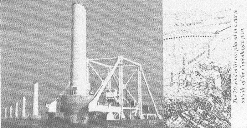 Les arguments en faveur des éoliennes implantées en mer, (très) proches des côtes, ou plus loin, sont nombreux; Vitesse du vent supérieure de 20% à celle sur terre. Moindre turbulence (pas d'obstacles). - Plus de place. - Impact moindre sur l'environnement. Les arguments "contre" sont: - coûts de construction plus élevés (fondations et raccordement aux réseaux). On estime qu'un quart environ des besoins électriques de l'Europe pourraient être couverts par l'éolien en mer. Cinq sites opérationnels (dont trois en Scandinavie) fonctionnent aujourd'hui. Deux Agences françaises cofinancent, pour l'heure, une étude de faisabilité pour un parc offshore de 50 moulins de 1MW en Méditerranée, au large de Gruissan et de Port-la-Nouvelle (ARENE Informations, octobre 2000 p.3). NB. Il existe une excellente étude (oct. 00), forte de 81 pages, effectuée pour compte de Greenpeace International, par diverses sommités et Instituts allemands. Son titre: "Offshore Wind Energy in the North Sea". MIDDELGRUNDEN est le nom de ce parc éolien en mer, très.exactement a 2 km du port de Copenhagen. Installé par 4 à 5 m de fond il fera tourner 20 éoliennes de marque Bonus Energy (DK), avec pales de 76 m de diamètre, dès décembre 2000.10 de celles-ci sont propriété de la coopérative "Danish Wind Cooperative" forte de 9000 membres, dont certains ont acheté 100% des parts de 23.000 FB chacune. En octobre 2000 déjà, toutes les parts étaient vendues car l'intérêt escompté est de 12,5% net d'impôts jusqu'à 5 parts) STATISTIQUE DANOISE Ce pays a dépassé le seuil des 2.000 MW éoliens à la fin juin. Ceci grâce à 5.947 moulins dont 327 installés entre janvier et juin 00. C'est 13% de la consommation électrique qui est ainsi générée (Windnieuws, octobre 00, p.22). (suite)