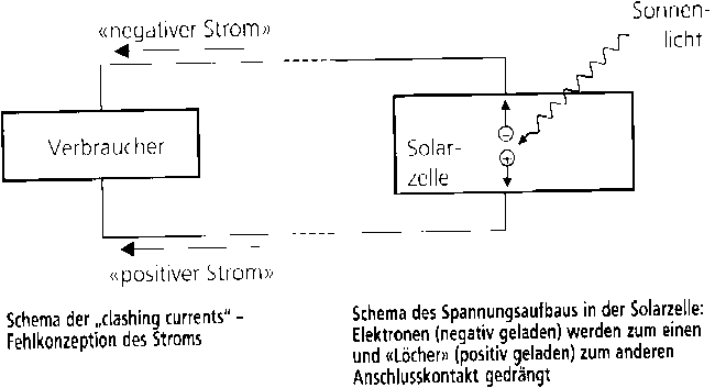 Tatsächlich stellten wir im Lernexperiment fest, dass die Standarderklärung aus Bild 1 die Fehlauffassung fördent. Auf einer von «ganz klar ja» bis «ganz klar nein» reichenden Beunteilungsskala nahmen MittelschülerInnen und Studierende einmal vor und einmal nach der Lektüre Stellung zu folgendem Satz: «Wird eine Solarzeile als Stromquelle mit einem Verbraucher verbunden, so fliessen alle Ladungsträger in beiden verbindenden Leitungsdrähten in Richtung Verbraucher.» Die Reaktionen verschoben sich durch die Lektüre markant in Richtung des sachlich falschen Ja-Pols [3].