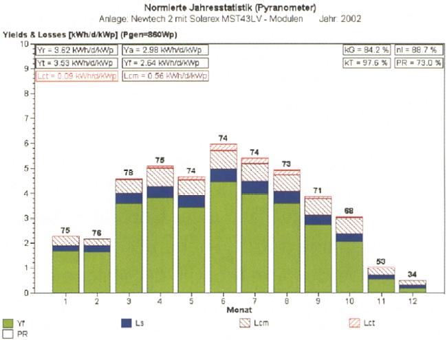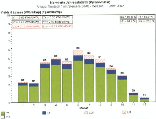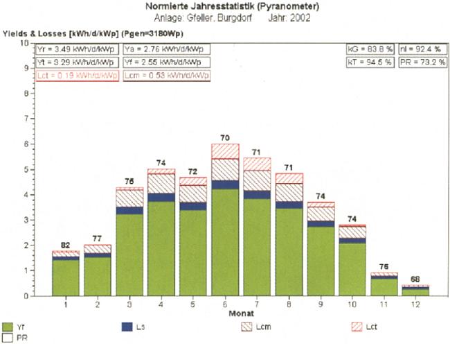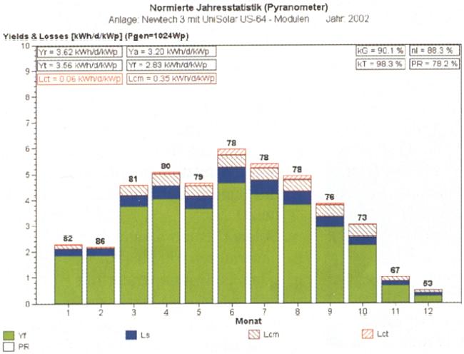 Der spezifische JahresEnergieertrag 2002 betrug 1091 kWh/kWp.