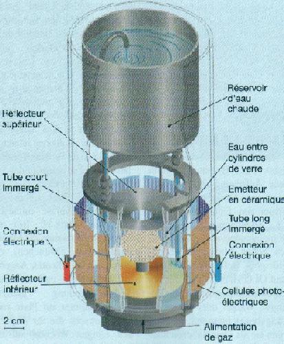 Par conséquent, les éléments les plus importants d'un générateur TPV sont une source de chaleur, un émetteur sélectif et les photodiodes. Les caractéristiques spectrales de l'émetteur et des cellules photoélectriques doivent être donc adaptées de manière à ce qu'elles se recouvrent le mieux possible. De plus, un filtre placé entre l'émetteur et les photodiodes permet d'éviter un échauffement excessif de ces dernières. Des travaux sont effectués à l'Institut Paul Scherrer (PSI) dans le but de démontrer la faisabilité dÌun générateur TPV devant être utilisé comme petite station de production combinée de chaleur et d'électricité. Ces travaux sont conduits en collaboration avec un partenaire industriel, Hovalwerk AG, Vaduz (Liechtenstein) et avec le support financier du fonds de recherche de l'industrie gazière suisse (FOGA). L'intention est de produire un appoint de quelques centaines de watts d'électricité, ainsi qu'environ 20 kW de chaleur. Description du prototype