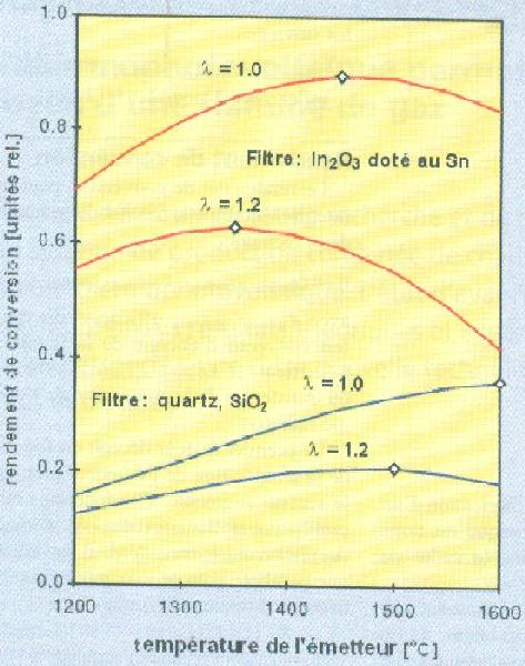 Un point essentiel pour le rendement d'un générateur TPV est l'adaptation des caractéristiques spectrales de l'émetteur sélectif à celles de la photodiode utilisée. Dans ce but, les oxydes des métaux du groupe des terres rares, tels l'ytterbium, l'erbium et l'holmium, se sont avérés comme étant particulièrement intéressants (fig. 2).