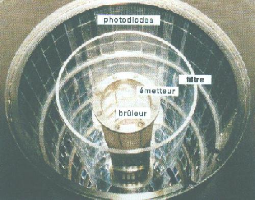 Situé entre le brûleur et les photodiodes, un filtre, réalisé ici par un écran d'eau s'écoulant entre deux cylindres de quartz, permet simultanément de protéger les cellules contre les gaz de combustion et d'absorber, ou mieux de réfléchir, le rayonnement inévitable de l'émetteur dans lÌinfrarouge lointain (longueurs d'onde >1200 nm). Un contact des gaz de combustion avec les photodiodes aurait pour conséquences un échauffement convectif inacceptable de celles-ci, ainsi qu'un encrassement rapide de leur surface. Les photodiodes utilisées présentent un rendement de 16% sous conditions standards (T= 25°C et Gn=1000 W/m2). Elles sont couplées en série afin d'obtenir une tension aussi élevée que possible. La surface active totale des cellules est de 380 cm2. Des réflecteurs axiaux, supérieur et inférieur, permettent de réduire au maximum les pertes axiales par rayonnement et contribuent ainsi également à mainte nir la température de l'émetteur à un niveau élevé. La puissance électrique de ce générateur TPV s'élève actuellement à 18W p.12