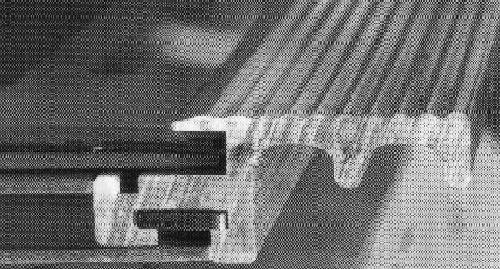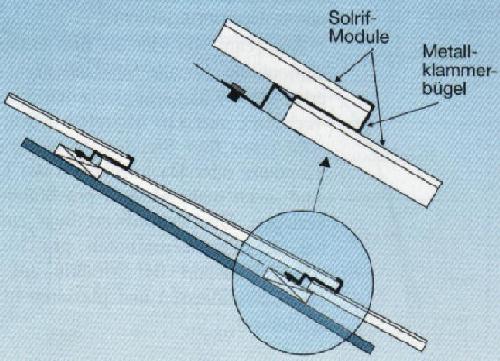 In vertikaler Richtung werden sie mittels Metallbügeln gehalten, die auf den Dachlatten befestigt sind (Bild 3). Durch diese Montageanordnung kann jedes Solrif-Modul wenn nötig einzeln aus der Gruppe herausgenommen und ausgewechselt werden.