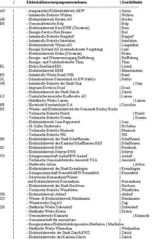 Der Aktionsleitung sind die in der Tabelle II zusammengestellten Unternehmen bekannt, die zum heutigen Zeitpunkt Solarstrom anbieten bzw. Solarstrom vermitteln (Stand 15.5.1999).