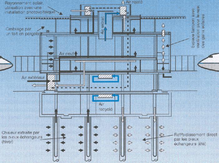 Une pompe à chaleur sera couplée aux pieux pour satisfaire des besoins de chauffage. Durant l'été, les pieux contribueront également au refroidissement du bâtiment en transférant directement une partie de ses charges thermiques dans le terrain.