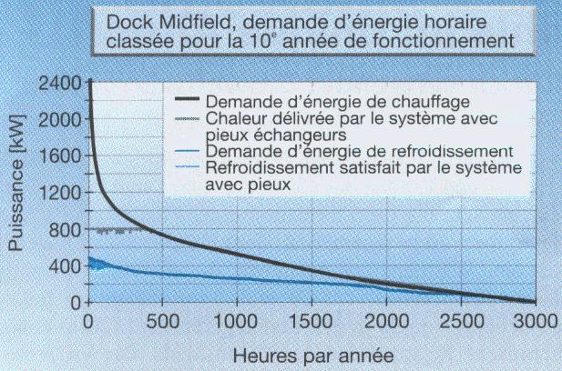 Les demandes de puissance de pointe sont couvertes par une source d'énergie auxiliaire, de manière à pouvoir faire travailler les pieux échangeurs en ruban (durée de marche élevée relativement à une puissance de transfert modeste). Le Dock Midfield a présenté de bonnes conditions pour une utilisation optimale de ses pieux échangeurs. Une réduction de la consommation d'énergie fossile sera réalisée sans faire augmenter la consommation globale d'énergie électrique.