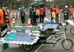 The "World Solar Challenge," a five-day solar-powered race across Australia, began Sunday. The car race, also called the Solar Odyssey 2001, begins in Darwin in northern Australia and bisects the continent, ending at Adelaide in southern Australia. This year the event also includes the World Solar Cycle Challenge, in which solar-assisted bicycles race from Alice Springs to Adelaide. More than 40 solar car teams are participating in the Solar Odyssey 2001, and 14 cycle teams are entered in the World Solar Cycle Challenge. |