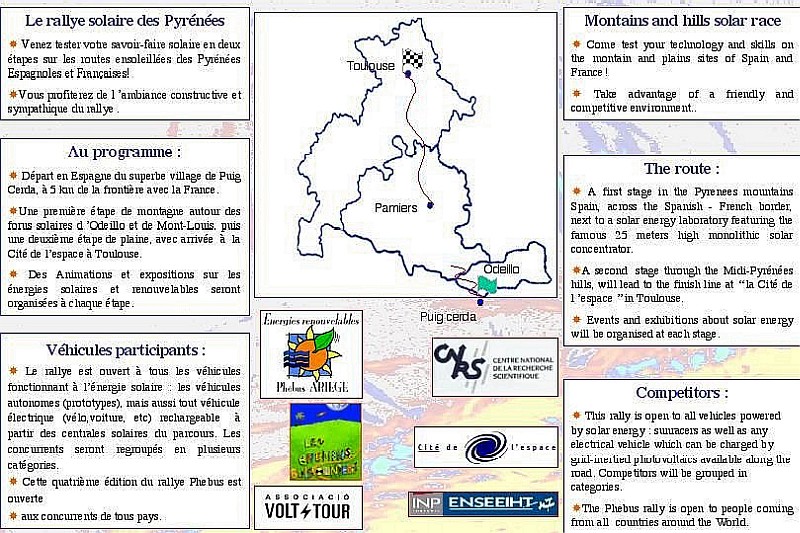 | Du 20 au 23 mai 2004, le premier Rallye solaire européen reliera la ville de Barcelone à Toulouse, via Perpignan et Odeillo-Font Romeu. Les 30 véhicules solaires admis à concourir seront répartis en cinq catégories. Un "village" sera installé dans chaque ville-étape pour infôrmer le jeune public sur les énergies renouvelables. | Cette manifestation s'inscrit dans le cadre du "Forum des Cultures 2004" qui sera célébré à Barcelone tout au long de l'année 2004 et l'arrivée sera jugée à la Cité de l'Espace à Toulouse. Les inscriptions sont ouvertes à partir de septembre. |