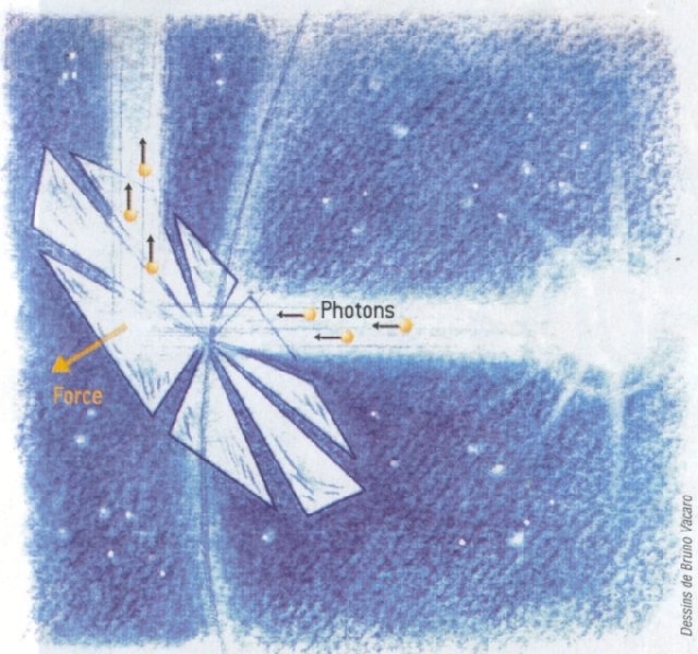 Le choc des photons Celle pression lumineuse est très faible. La quantité de mouvement d'un photon étant égale à son énergie divisée par la vitesse de la lumière, un flux de photons exerce sur une surface absorbante (noircie) une force égale à la puissance absorbée diviséepar la vitesse de la lumière. Un fasceau lumineux de un watt exerce ainsi une force de trois milliardièmes de newton - soit, pour une surface de un millimètre carré, une pression de quelques millièmes de pascals. Quoiqu'infime, la pression de radiation est efficace quand elle pousse des objets de masse faible ou quand elle agit longtemps. Les physiciens ralentissent ainsi des jets d'atomes dans les expériences où ils créent des nuages atomiques ultra-froids. Un atome de césium a une masse d'environ 3x10-25 kilogramme; percuté chaque seconde par 20 millions de photons de longueur d'onde 850 nanomètres allant à sa rencontre, l'atome subit une accélération égale à 5.000 fois celle de la pesanteur: s'il se déplace à 300 mètres par seconde, l'atome est immobilisé en six millisecondes au bout de un mètre. L'action prolongée de la pression de radiation peut se manifester dans l'espace, où aucun frottement ne s'oppose au mouvement. Tel est le principe des voiles solaires (voir la figure 1). Au niveau de la Terre, la puissance solaire reçue par une surface orthogonale au flux lumineux est de 1,4 kilowatt par mètre carré, ce qui correspond à une force de 4 millionièmes de newton. Avec un matériau réfléchissant, on double la valeur de cette force: les photons, réfléchis par le miroir, repartent avec une vitesse opposée à leur vitesse initiale, transférant ainsi deux fois leur quantité de mouvement à la voile. |