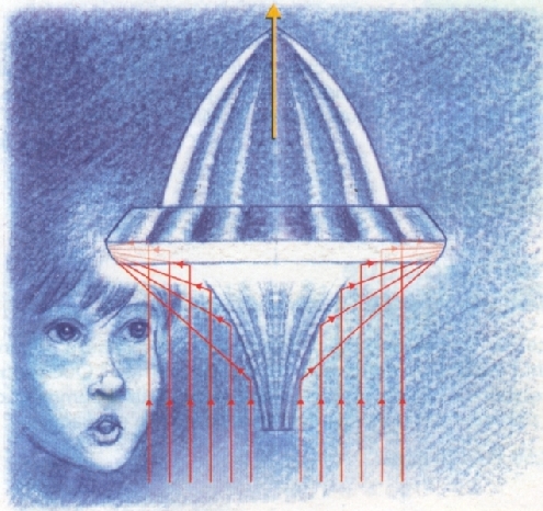 Le détour par le radiomètre montre que l'absorption de lumière permet d'élever la température et de faire circuler l'air. Le projet expérimental de Lightcraft Technologies est bâti sur cette idée: une source lumineuse chauffe à distance le gaz dans la chaudière d'un engin, gaz dont l'éjection propulse l'engin. Une maquette de 50 grammes, soumise à un faisceau laser de 10 kilowatts, s'est ainsi élevée dans le désert du Nouveau-Mexique à 71 mètres de hauteur. La lumière du laser, focalisée le long d'une couronne grâce à la forme paraboloïde de la face inférieure de l'engin (voir la figure 3), a porté l'air ambiant à plus de 10.000°C, soit plus que la température de surface du Soleil. A une telle température, les molécules de l'air sont totalement ionisées et la brutale dilatation du plasma ainsi formé pousse l'engin. Reste que, pour satelliser une masse de un kilogramme, il faudra un laser d'au moins un mégawatt... Jean-Michel Courty