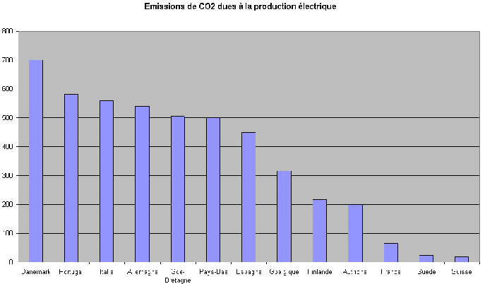 Excusez la qualité du document, mais on voit que la production de CO2 au Danemark (700) est 30 fois supérieure à celle de la Suède (22)!