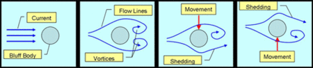 Lorsqu'un courant (Current) heurte un obstacle (Bluff Body), les lignes de courant (Flow Lines) s'écartent de part et d'autre puis se rassemblent derrière en formant des tourbillons (Vortices). Mais le phénomène est irrégulier et, parfois, un flux direct évacue l'eau sans créer de tourbillon (Shedding), d'un côté ou de l'autre. Cette dissymétrie génère une force de pression sur l'obstacle et, s'il est mobile, un mouvement (Movement). © Vortex Hydro Energy 'Fish Technology' Draws Renewable Energy From