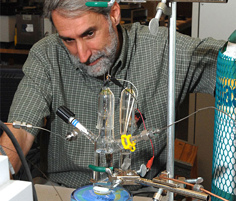 Daniel Nocera poses with a device for breaking down water into hydrogen