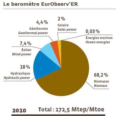 * Etat des énergies renouvelables en Europe 2011 (energies-renouvelables.org) * Pour info, part de chaque énergie dans la consommation d'énergie primaire renouvelable de l'Union européenne fin 2010 (energies-renouvelables.org) * Voir aussi http://www.futura-sciences.com/fr/ |