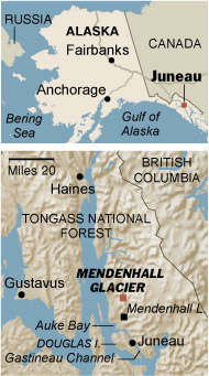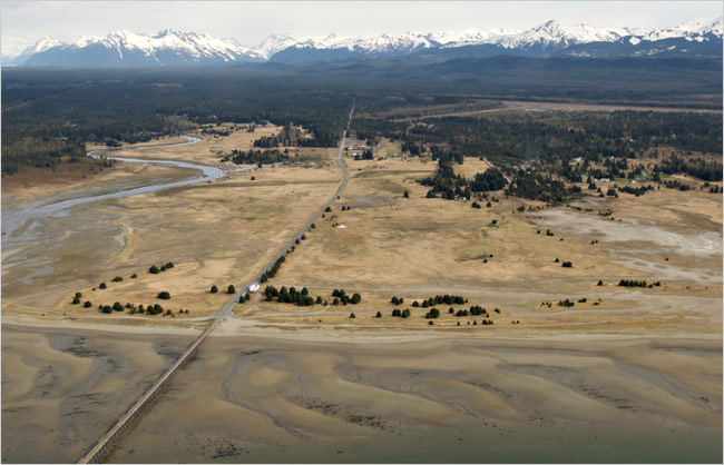 The geology is complex, but it boils down to this: Relieved of billions of tons of glacial weight, the land has risen much as a cushion regains its shape after someone gets up from a couch. The land is ascending so fast that the rising seas — a ubiquitous byproduct of global warming — cannot keep pace. As a result, the relative sea level is falling, at a rate "among the highest ever recorded," according to a 2007 report by a panel of experts convened by Mayor Bruce Botelho of Juneau. Greenland and a few other places have experienced similar effects from widespread glacial melting that began more than 200 years ago, geologists say. But, they say, the effects are more noticeable in and near Juneau, where most glaciers are retreating 30 feet a year or more. As a result, the region faces unusual environmental challenges. As the sea level falls relative to the land, water tables fall, too, and streams and wetlands dry out. Land is emerging from the water to replace the lost wetlands, shifting property boundaries and causing people to argue about who owns the acreage and how it should be used. And meltwater carries the sediment scoured long ago by the glaciers to the coast, where it clouds the water and silts up once-navigable channels. A few decades ago, large boats could sail regularly along Gastineau Channel between Downtown Juneau and Douglas Island, to Auke Bay, a port about 10 miles to the northwest. Today, much of the channel is exposed mudflat at low tide. "There is so much sediment coming in from the Mendenhall Glacier and the rivers — it has basically silted in," said Bruce Molnia, a geologist at the United States Geological Survey who studies Alaskan glaciers. Already, people can wade across the channel at low tide — or race across it, as they do in the Mendenhall Mud Run. At low tide, the navigation buoys rest on mud. Eventually, as the land rises and the channel silts up, Douglas Island will be linked to the mainland by dry land, said Eran Hood, a hydrologist at the University of Alaska Southeast and an author of the 2007 report, "Climate Change: Predicted Impacts on Juneau." When that happens, Dr. Hood said, the Mendenhall Wetlands State Game Refuge, 4,000 acres of boggy habitat, will be lost. "That wetland will have nowhere else to go," he said. In some places along the coast, the change has been so rapid that kayakers whose charts are not up-to-the-minute can find themselves carrying their boats over shoals that are now so high and dry they now support grass or even small trees. In and around Juneau, "you can walk around and see what was underwater is turning into grassland and eventually into forest," Dr. Hood said. The topographical changes have threatened crucial ecosystems and even locally vital species like salmon. "The lifeblood of our region has been salmon species and their return — and what is the impact when they return and the streams are dry?" said Mayor Botelho, who was born and raised in Juneau. "The salmon is bound to our identity as a region, who we are." He said he did not think that any species were in imminent danger, but added, "Anyone who is following climate change has to see that there are risks, perhaps great ones." Dr. Hood said many people in Juneau had hoped to maintain a waterway called Duck Creek as a salmon stream. But small streams like that "appear to be drying out," he said. "There are a lot of people in town saying, Let's just let it return to a greenway." Relative to the sea, land here has risen as much as 10 feet in little more than 200 years, according to the 2007 report. As global warming accelerates, the land will continue to rise, perhaps three more feet by 2100, scientists say. The rise is further fueled by the movement of the tectonic plates that form the earth's crust. As the Pacific plate pushes under the North American plate, Juneau and its hilly Tongass National Forest environs rise still more. "When you combine tectonics and glacial readjustment, you get rates that are incomprehensible," Dr. Molnia said. In Gustavus, where Mr. DeBoer's property is, the land is rising almost three inches a year, Dr. Molnia said, making it "the fastest-rising place in North America." In addition to expanding the golf course, Mr. DeBoer is negotiating with the Nature Conservancy to preserve some of the newly emergent land. He can do both, he said, because the high tide line has pushed almost a mile out to sea since his family first homesteaded on the property. Where the shoreline is relatively flat, "it doesn't take much uplift to make quite a bit of difference," Mr. DeBoer said. Kristin White, a 28-year-old schoolteacher who grew up in Haines, a town north of here, is from another family in the area whose real estate grew as land rose. When her father tried to sell some property in Haines, she said, "he had to have it resurveyed." But for Ms. White, who has vivid memories of visiting the Mendenhall glacier as a child, the gain in acreage has been bittersweet. Seeing the glacier retreat, she said, is "as if you lived in the Smoky Mountains and you were used to seeing certain peaks — and they disappeared. It's just totally, totally sad." |