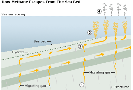 powerful greenhouse gas methane is escaping from the Arctic sea-bed.