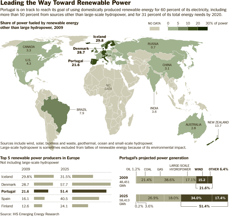 By ELISABETH ROSENTHAL LISBON — Five years ago, the leaders of this sun-scorched, wind-swept nation made a bet: To reduce Portugal's dependence on imported fossil fuels, they embarked on an array of ambitious renewable energy projects — primarily harnessing the country's wind and hydropower, but also its sunlight and ocean waves. Today, Lisbon's trendy bars, Porto's factories and the Algarve's glamorous resorts are powered substantially by clean energy. Nearly 45% of the electricity in Portugal's grid will come from renewable sources this year, up from 17 percent just five years ago. Land-based wind power — this year deemed "potentially competitive" with fossil fuels by the International Energy Agency in Paris — has expanded sevenfold in that time. And Portugal expects in 2011 to become the first country to inaugurate a national network of charging stations for electric cars. "I've seen all the smiles — you know: It's a good dream. It can't compete. It's too expensive,” said Prime Minister José Sócrates, recalling the way Silvio Berlusconi, the Italian prime minister, mockingly offered to build him an electric Ferrari. Mr. Sócrates added, “The experience of Portugal shows that it is possible to make these changes in a very short time.” The oil spill in the Gulf of Mexico has renewed questions about the risks and unpredictable costs of America's unremitting dependence on fossil fuels. President Obama has seized on the opportunity to promote his goal of having 20 to 25 percent of America's electricity produced from renewable sources by 2025. While Portugal's experience shows that rapid progress is achievable, it also highlights the price of such a transition. Portuguese households have long paid about twice what Americans pay for electricity, and prices have risen 15 percent in the last five years, probably partly because of the renewable energy program, the International Energy Agency says. Although a 2009 report by the agency called Portugal's renewable energy transition a “remarkable success,” it added, “It is not fully clear that their costs, both financial and economic, as well as their impact on final consumer energy prices, are well understood and appreciated.” Indeed, complaints about rising electricity rates are a mainstay of pensioners' gossip here. Mr. Sócrates, who after a landslide victory in 2005 pushed through the major elements of the energy makeover over the objections of the country's fossil fuel industry, survived last year's election only as the leader of a weak coalition. “You cannot imagine the pressure we suffered that first year,” said Manuel Pinho, Portugal's minister of economy and innovation from 2005 until last year, who largely masterminded the transition, adding, “Politicians must take tough decisions.” Still, aggressive national policies to accelerate renewable energy use are succeeding in Portugal and some other countries, according to a recent report by IHS Emerging Energy Research of Cambridge, Mass., a leading energy consulting firm. By 2025, the report projected, Ireland, Denmark and Britain will also get 40 percent or more of their electricity from renewable sources; if power from large-scale hydroelectric dams, an older type of renewable energy, is included, countries like Canada and Brazil join the list. The United States, which last year generated less than 5 percent of its power from newer forms of renewable energy, will lag behind at 16 percent (or just over 20 percent, including hydroelectric power), according to IHS. To force Portugal's energy transition, Mr. Sócrates's government restructured and privatized former state energy utilities to create a grid better suited to renewable power sources. To lure private companies into Portugal's new market, the government gave them contracts locking in a stable price for 15 years — a subsidy that varied by technology and was initially high but decreased with each new contract round. Compared with the United States, European countries have powerful incentives to pursue renewable energy. Many, like Portugal, have little fossil fuel of their own, and the European Union's emissions trading system discourages fossil fuel use by requiring industry to essentially pay for excessive carbon dioxide emissions. Portugal was well poised to be a guinea pig because it has large untapped resources of wind and river power, the two most cost-effective renewable sources. Government officials say the energy transformation required no increase in taxes or public debt, precisely because the new sources of electricity, which require no fuel and produce no emissions, replaced electricity previously produced by buying and burning imported natural gas, coal and oil. By 2014 the renewable energy program will allow Portugal to fully close at least two conventional power plants and reduce the operation of others. "So far the program has placed no stress on the national budget” and has not created government debt, said Shinji Fujino, head of the International Energy Agency's country study division. If the United States is to catch up to countries like Portugal, energy experts say, it must overcome obstacles like a fragmented, outdated energy grid poorly suited to renewable energy; a historic reliance on plentiful and cheap supplies of fossil fuels, especially coal; powerful oil and coal industries that often oppose incentives for renewable development; and energy policy that is heavily influenced by individual states. The relative costs of an energy transition would inevitably be higher in the United States than in Portugal. But as the expense of renewable power drops, an increasing number of countries see such a shift as worthwhile, said Alex Klein, research director, clean and renewable power generation, at IHS. "The cost gap will close in the next decade, but what you get right away is an energy supply that is domestically controlled and safer,” Mr. Klein said. Necessity Drives Change