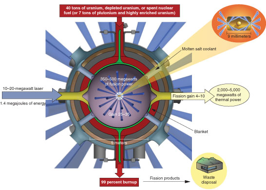 https://str.llnl.gov/ ![]() LIFE (Laser Inertial Fusion Energy) is an approach to pure fusion energy as well as a once-through, closed nuclear fuel cycle. A LIFE power plant comprises a solid-state laser system and a fusion target chamber that can be surrounded by a subcritical fission blanket. The balance of the plant includes a fusion target factory, a heat exchanger, and other systems. The LIFE engine starts with a 10- to 20-megawatt diode-pumped solid-state laser system to provide about 1.4 megajoules of energy. Deuterium–tritium fusion targets are injected at 10 to 15 times a second into the center of a 2.5-meter-radius fusion chamber. The laser beams ignite the fusion targets to obtain energy gains of 25 to 35 and fusion yields of 35 to 50 megajoules of energy, thereby creating 350 to 500 megawatts of fusion power (about 80 percent in the form of fusion neutrons, with the rest of the energy in x rays and ions). Each fusion target generates about 1019 neutrons. The fusion neutrons can also drive fission reactions in a surrounding subcritical fission blanket. The target chamber’s structural steel wall is made of low-activation oxide-dispersion-strengthened ferritic steel coated with 250 to 500 micrometers of tungsten to provide resistance to damage by high-energy fusion neutrons and the high temperatures resulting from absorption of the x rays emitted from the LIFE targets. The fusion neutrons pass through the first structural steel wall to a layer of metallic pebbles, which moderate the energy of the fusion neutrons and generate 1.8 neutrons for each neutron they absorb. (...) |