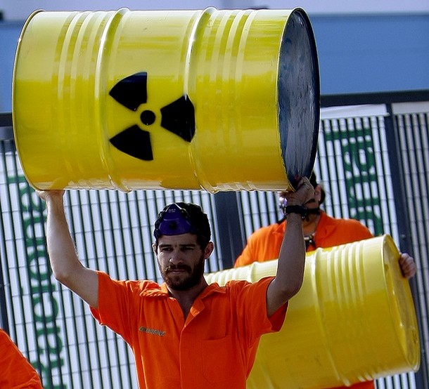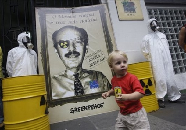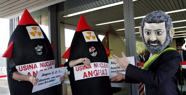 Brasilia, 25 Juin 2007: manifestation de Greenpeace devant le Ministère de l'Énergie contre la décision de construire la centrale Angra 3, à Angra dos Reis, à 300 km au sud de Rio de Janeiro. Photo AFP/Getty Images