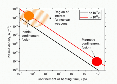 Ce plasma lui-même, composé d'électrons et d'ions, doit se trouver dans des conditions de température et de densité d'électrons libres telles que les réactions thermonucléaires de fusion y soient possibles. Avec un mélange approprié d'hydrogène (H), de deutérium (2D), de tritium (3T) et d'hélium 3 (3He), plusieurs réactions sont possibles mais elles ne sont pas toutes aussi faciles à réaliser. 1. 2D + 2D -> (3He + 0,82 MeV) + (n