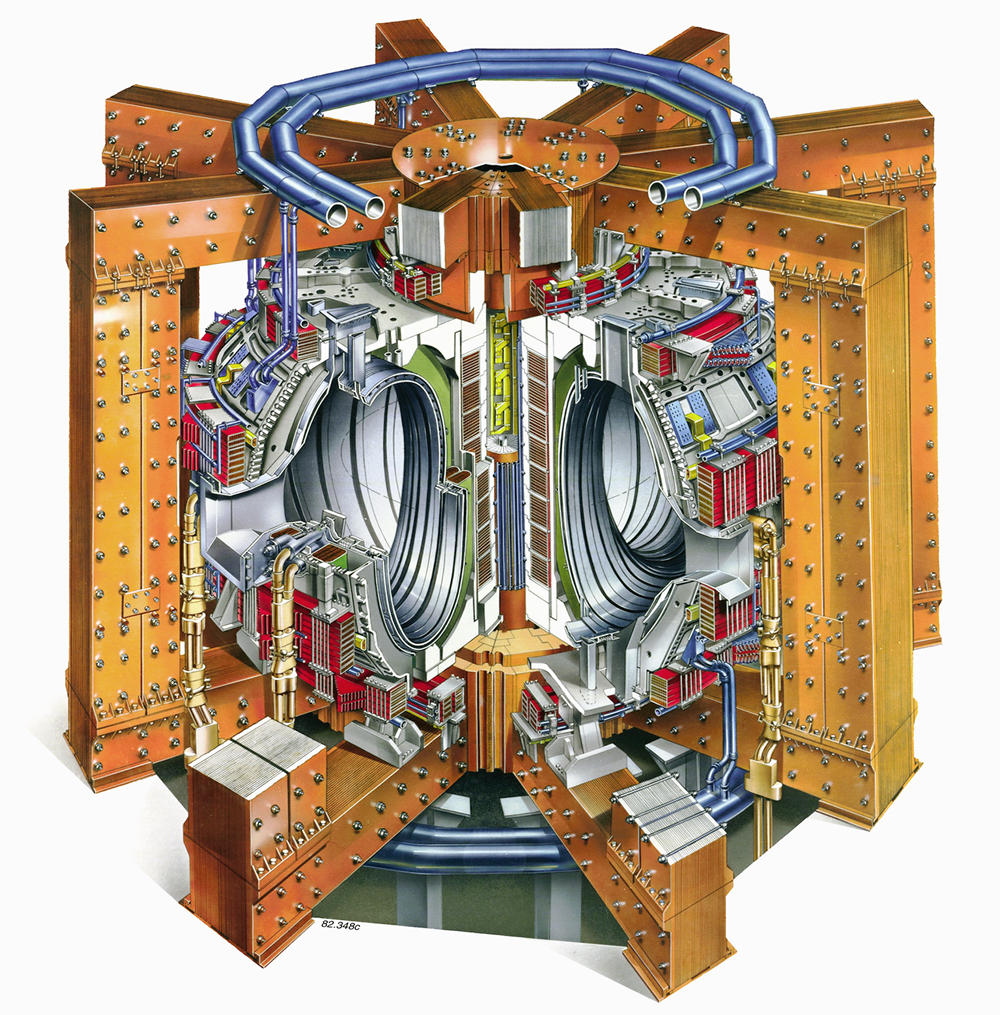 Le tokamak européen JET à gauche à l'arrêt et à droite en fonctionnement avec du plasma chaud. Crédit : BNES YGN Plusieurs tokamaks ont vu le jour dans le monde et l'un des plus célèbres est celui du JET (acronyme de l'anglais Joint European Torus, Tore commun européen). Situé près d'Oxford au Royaume-Uni, il est le plus grand du monde. Sa construction a débuté en 1979 et il est entré en fonctionnement en 1983.