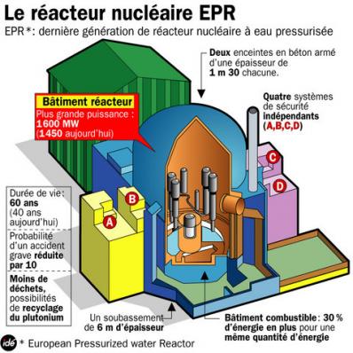 Comme tous les réacteurs nucléaires, il n'émet pas de CO2, et ne participe donc pas à l'effet de serre responsable du changement climatique. De plus, ses constructeurs annoncent que sa sécurité a été renforcée, avec quatre systèmes indépendants au lieu de trois précédemment et un dispositif permettant de récupérer le cœur du réacteur si celui-ci venait à fondre. Contacté par 20minutes.fr, EDF précise également que ce modèle utilise 17% de combustible en moins, et réduit de 30% le volume des déchets rejetés. Enfin, le maire de Dieppe Sébastien Jumel rappelle que «cela représente 2.000 emplois pendant les cinq ans du chantier et 300 emplois pérennes après». Quels sont ses inconvénients? Pour l'association Greenpeace, et Bernard Laponche, expert international en politique énergétique, contactés par 20minutes.fr le principal inconvénient est la toxicité accrue des déchets. Bernard Laponche explique que «le réacteur utilise le combustible plus longtemps, donc en consomme moins et produit moins de déchets, mais leur radiotoxicité s'en trouve augmentée». Résultat, selon lui, «la radioactivité reste équivalente». Quant à la sécurité, le spécialiste en énergie de Greenpeace note que les dispositifs ont été augmentés, mais que «le réacteur ne résisterait pas à la chute d'un avion de type gros porteur». Bernard Laponche ajoute que, si les dispositifs ont été améliorés, «il ne s'agit pas réellement d'un réacteur de nouvelle génération», mais plutôt d'une amélioration du modèle précédent, conçu aux Etats-Unis dans les années 60. Voir aussi: http://www.romandie.com/ |