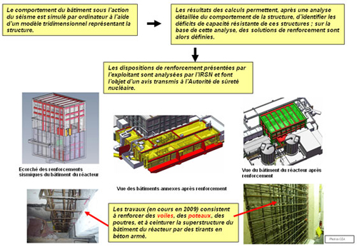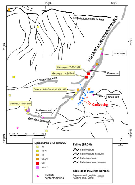 Pour ce qui concerne les installations nucléaires, l'aléa sismique est pris en compte dès la conception des installations et fait par la suite l'objet de réévaluations régulières, pour tenir compte de l'évolution des connaissances. Un texte para réglementaire (Règle Fondamentale de Sûreté) indique une méthode acceptable pour déterminer «l'aléa sismique» à retenir pour ces installations; cette méthode s'appuie sur l'analyse de données géologiques et sismologiques pour définir in fine des mouvements sismiques caractéristiques du site. Afin d'améliorer ses connaissances en matière d'aléa sismique, l'IRSN conduit des programmes de recherches tant dans le domaine de la géologie que dans celui de la sismologie. C'est en particulier le cas dans la vallée de la moyenne Durance où se trouve une faille caractérisée par une sismicité régulière, où l'IRSN a conduit durant la dernière décennie des travaux qui ont permis de cartographier et de mieux comprendre le fonctionnement de la faille de la Moyenne Durance. Certains résultats de ces travaux ont permis de préciser l'aléa sismique pour le site de Cadarache, notamment par une localisation plus précise de la faille active la plus proche du site. Les résultats des travaux présentés dans ce dossier et d'autres travaux de l'IRSN pourront conduire à terme à des aménagements de l'approche retenue pour la détermination de l'aléa sismique pour les sites d'installations nucléaires.