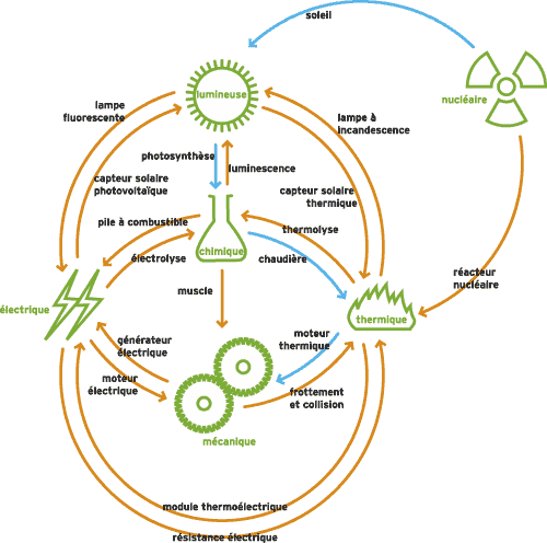 Les formes communes d'énergie sont l'énergie mécanique (potentielle et cinétique), l'énergie thermique, l'énergie électromagnétique (électricité, lumière), l'énergie nucléaire ou radiative, et l'énergie chimique. L'énergie peut se diviser et se transformer mais la somme des énergies transformées est toujours égale à l'énergie initiale (premier principe de thermodynamique). Exemple : dans un moteur électrique, l'énergie électromagnétique se transforme en énergie mécanique (mouvement) ET en énergie thermique (chaleur). Malheureusement, on n'arrive JAMAIS à récupérer toute l'énergie transformée, une partie se dissipe en chaleur dans la "nature" (deuxième principe de thermodynamique: l'entropie). Les questions liées à l'énergie et