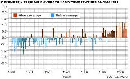 "La présence d'El Nino ainsi que la tendance continue au réchauffement climatique" ont contribué à faire du mois de janvier 2007 le plus chaud jamais connu, explique l'administration américaine dans son communiqué. Ces températures anormalement élevées ont aussi engendré les chutes de neige les deuxièmes plus faibles sur le continent eurasiatique. "Durant le siècle passé, les températures mondiales en surface ont progressé à un rythme de 0,06 degré celsius tous les 10 ans, mais le taux d'augmentation a été trois fois plus élevé depuis 1976, soit 0,18 degré tous les 10 ans, avec certaines des plus fortes augmentations de températures intervenues dans les latitudes élevées de l'hémisphère nord", soit près du pôle nord, a ajouté le NOAA. |