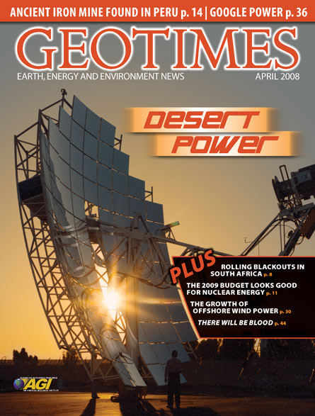 ![]() Alexandria, VA – What does the future hold for solar power? Geotimes magazine looks into more efficient ways of turning the sun’s power into electricity in its April cover story, "Desert Power: A Solar Renaissance." http://www.geotimes.org/current/ http://www.geotimes.org/apr08/article.html?id=feature_solar.html |