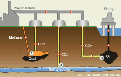 Fredric Hauge, Président de la Fondation Bellona, une ONG norvégienne, propose une autre solution, qui consisterait à injecter du CO2 dans les puits de charbon, afin de produire du méthane. Cette autre solution nécessite que les technologies de séparation du CO2 des mélanges gazeux dégagés par l'industrie soient au point. Fredric Hauge estime qu'il faudra au moins 30 ans pour développer des technologies efficaces. |