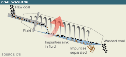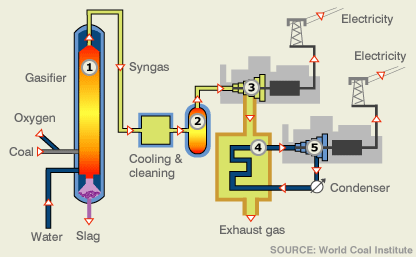 Les centrales à cycle combiné sont composées d'une turbine à gaz, similaire à un réacteur d'avion sauf que l'énergie produite sert à entraîner un alternateur, et les gaz d'échappement de cette turbine sont récupérées pour produire de la vapeur; celle-ci entraîne une turbine à vapeur conventionnelle reliée à un autre alternateur. L'efficacité du procédé est d'environ 55% contre 35% pour une centrale conventionnelle, composée d'un générateur de vapeur et d'une turbine à vapeur. Si la plupart des centrales à gaz sont équipées de cette technologie, ce n'est pas le cas pour le charbon qui, même gazéifié, c'est-à-dire transformé en gaz de synthèse (CO+H2) par combustion partielle, possède toujours des impuretés minérales comme de la silice et du soufre. Après la combustion, ces impuretés, abrasives ou sous forme de gaz acide, provoquent des dommages sur les aubages de la turbine. Mais avec plus de 160 ans de réserves estimées contre 70 ans pour le gaz, le charbon effectue un retour en force, d'où l'importance de la recherche sur les technologies de charbon "propre". La technologie étudiée par l'Université de Nottingham est la lixiviation, c'est-à-dire l'extraction d'une substance soluble d'un mélange de corps solides, en diffusant ou en faisant circuler un solvant à travers l'ensemble. Ici, le charbon est moulu finement puis flotte sur de l'acide fluorhydrique qui dissout la silice. Le charbon est ensuite filtré puis replonge dans une autre solution contenant un agent oxydant qui enlève la pyrite, soufre minéral (sulfures de fer, de cobalt ou de nickel). |