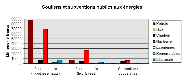 Par soutien nous entendons "toute distorsion du système de prix qui induit un avantage compétitif d'un bien au détriment d'un autre". La situation la plus simple d'un tel soutien est celle d'une subvention budgétaire payée par le contribuable en faveur de telle ou telle énergie.